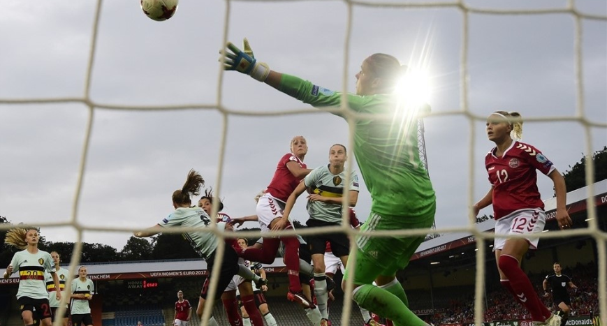 Dinamarca comenzó las acciones con varias llegadas al arco belga, que le permitió generar peligro, hasta la llegada del gol en el minuto 6, Harder lanza un tiro libre, y la arquera Oderus alcanza a tocarla para que se estrelle en el horizontal, pero el área estaba llena de jugadoras danesas y finalmente es Troelsgaard la que se encarga de abrir el marcador con un cabezazo ganando el salto a las defensoras. Este gol se convierte en la anotación número 38, en 112 apariciones para la jugadora.